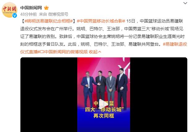 15日,中国篮球运动员易建联退役仪式发布会在广州举行。姚明、巴特尔、王治郅,中国男篮三大“移动长城”现场见证了易建联的告别。致辞后,中国篮球协会主席姚明将一份记录易建联职业生涯高光时刻的相框送予昔日队友。此后,姚明、巴特尔、王治郅、易建联共同登台。