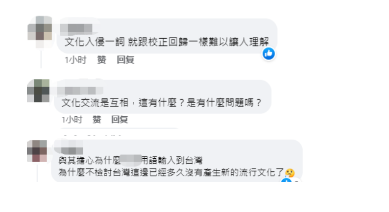 而对于“文化入侵”的说法,在脸书上,也有网民称,“文化入侵一词,就跟校正回归一样难以让人理解。”“文化交流是互相,这有什么?是有什么问题吗?”“与其担心为什么大陆用语输入到台湾,为什么不检讨台湾这边已经多久没有产生新的流行文化了。” ↓