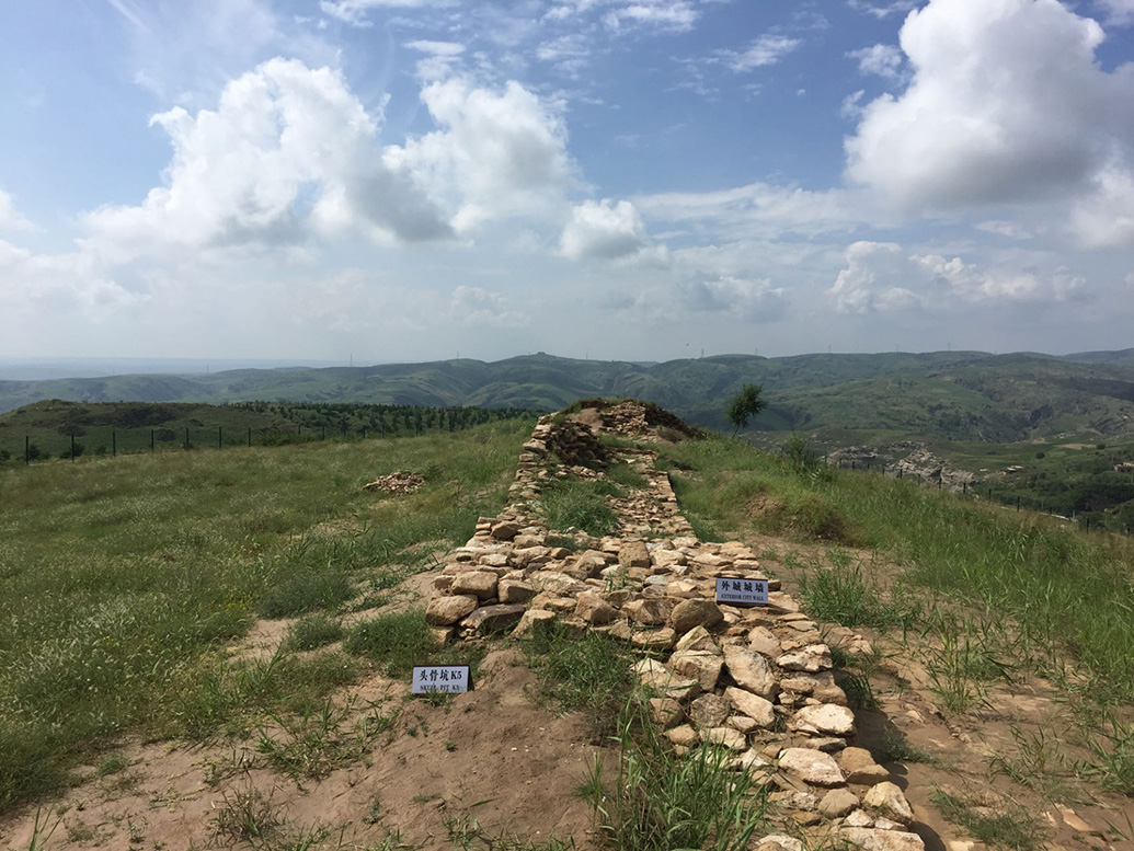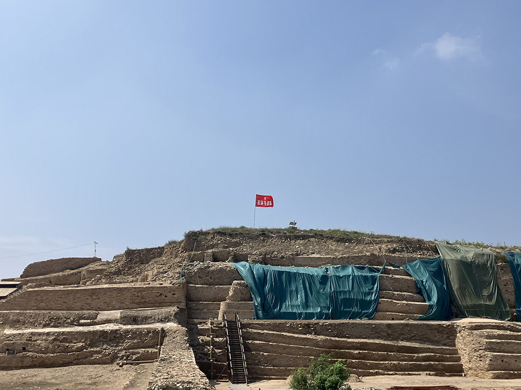 石峁遗址地处黄土高原北部、毛乌素沙漠南缘,初建于距今4300年前后,是一座超大型石砌城址。城内面积逾400万平方米,相当于6个故宫,其由皇城台、内城、外城三重城垣组成,是我国乃至东亚地区目前发现的最早的形制完备、结构清晰、保存完好、规模最大的史前城址。经考古发掘,城防设施、工事建筑、大型墓地、手工业作坊等遗迹一一面世,并出土了数以万计的文物。