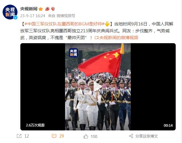 当地时间9月16日,中国人民解放军三军仪仗队亮相墨西哥独立213周年庆典阅兵式。网友:步伐整齐,气势威武,英姿飒爽,不愧是“最帅天团”!
