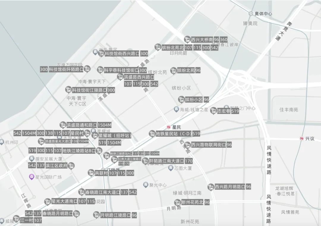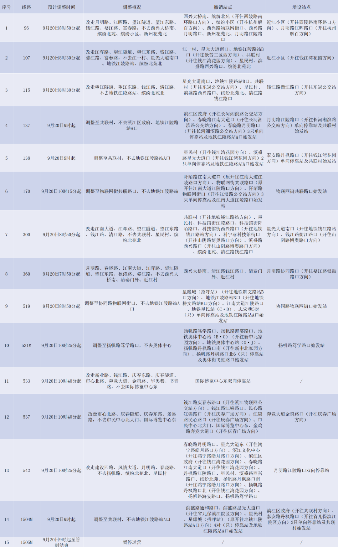 96、107、115、137、138、170、300、360、519、1504M、1505M路 等线路调整后不再停靠西兴大桥南、缤纷北苑北、缤纷北苑、缤纷小区、新州花苑北、江一村、滨江区政府、星光大道南口、地铁江陵路站、地铁星民站、共联村、星民村、清江路钱江路口、清泰门外、近江村等站点。