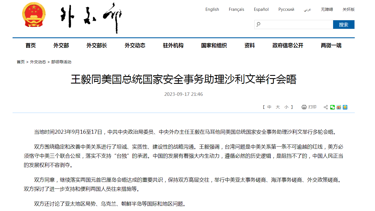 当地时间2023年9月16至17日,中共中央政治局委员、中央外办主任王毅在马耳他同美国总统国家安全事务助理沙利文举行多轮会晤。