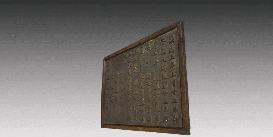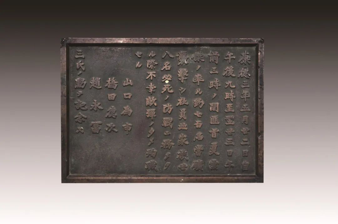 这块碑文铜牌来自黑龙江鹤岗矿区的一座“忠灵塔”上,是日本侵略者为侵华战争中战死的日伪军而建。碑文铜牌,长51厘米、高36.5厘米、宽2厘米、重12千克。上面的文字记载了日伪军和抗联战士战斗过程。