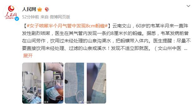据@人民网报道,云南文山,60岁的韦某半月来一直阵发性剧烈咳嗽,医生在其气管内发现一条约8厘米长的蚂蝗。据悉,韦某发病前曾在山间劳作,饮用过未经处理的山泉沟渠水,把蚂蟥带入体内。医生提醒:尽量不要直接饮用未经处理、过滤的山泉或溪水!发现不适立即就医。