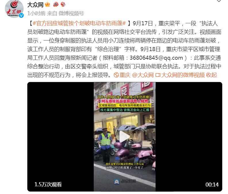9月17日,重庆梁平,一段“执法人员划破路边电动车防雨棚”的视频在网络社交平台流传,引发广泛关注。视频画面显示,一位身穿制服的执法人员用小刀连续将两辆停在路边的电动车防雨棚划破,该工作人员的制服背部印有“综合治理”字样。9月18日,重庆市梁平区城市管理局工作人员回复海报新闻记者:此事系交通综合整治行动,由区交警牵头组织,城管部门只是协助联合执法。对于执法过程中出现的不规范行为,将会上报领导。