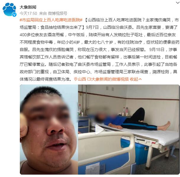 9月7日,山西临汾曲沃县。吕先生家喜宴,宴请了400多位亲友去酒店用餐,中午饭后,陆续开始有人发烧拉肚子呕吐,最后近百位亲友不同程度食物中毒,年纪小的4岁,最大的七八十岁,有的住院治疗,症状轻的便拿些药自服。吕先生愧疚的捂脸痛哭,称现在压力很大,事发当天已经报警。 9月18日,涉事宾馆餐饮部工作人员告诉记者,他们餐厅食物都有留样,出事后第一时间送检,目前餐厅已暂停营业。随后记者致电了曲沃县市场监管局,工作人员表示,此事引起了当地各政府部门的重视,由卫体局、疾控中心、市场监督管理局三家联合调查,溯源检测,具体情况以最终调查结果为准。