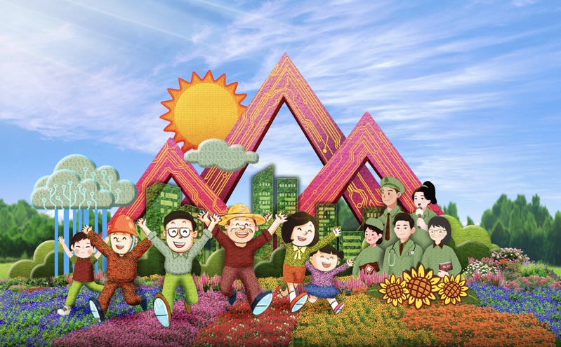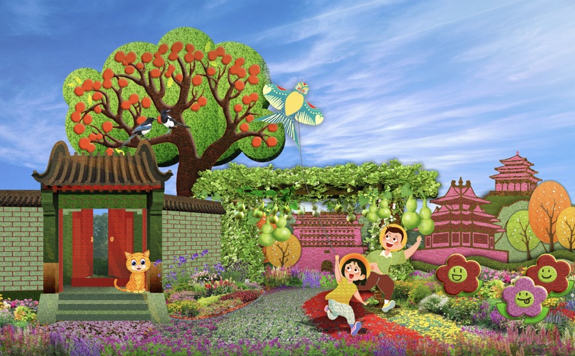 3,东单东南角的“共同富裕”主题花坛顶高达9.5米,以欣欣向荣的城乡融合发展为场景,描绘了中国式现代化全体人民共同富裕的美好蓝图。