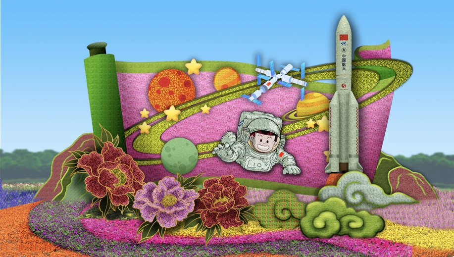 10,复兴门东北角的“筑梦未来”花坛顶高8.5米,以中国航天员、空间站为主景,寓意航天强国建设蓬勃发展,助力中国梦早日实现,全面推进中华民族伟大复兴,谱写新时代中国特色社会主义更加绚丽的华章。