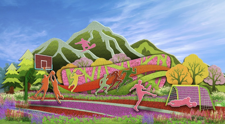 6,西单东北角的“全民健身”花坛顶高8.5米,以丰富多彩的全民健身为题材,配以篮球、羽毛球、跑步、滑雪等运动场景,寓意全民健身共享美好生活。