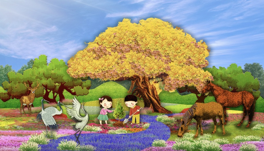 4,东单西北角的“和谐共生”花坛顶高8.5米,“三北工程”绿色长城为主景,配以野马(西北)、麋鹿(华北)、白鹤(东北)、胡杨等典型物种,体现了生态治理的典范,寓意坚定不移走好人与自然和谐共生的中国式现代化之路。