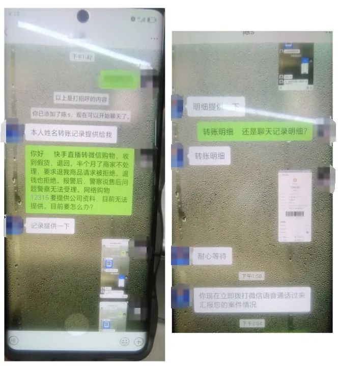 经了解潘女士前几天在微信上退货后商家一直没有给她退款,她感觉自己被骗了,于是在网上搜索到了一个退款的网址,将情况向“客服”说明后“客服”给了一个自称是“广州反诈中心刘警官”的微信账号让她添加,随后潘女士便与对方进行微信语音通话,对方让她提供个人信息以及转账记录凭证,以便帮助潘女士受案办理。