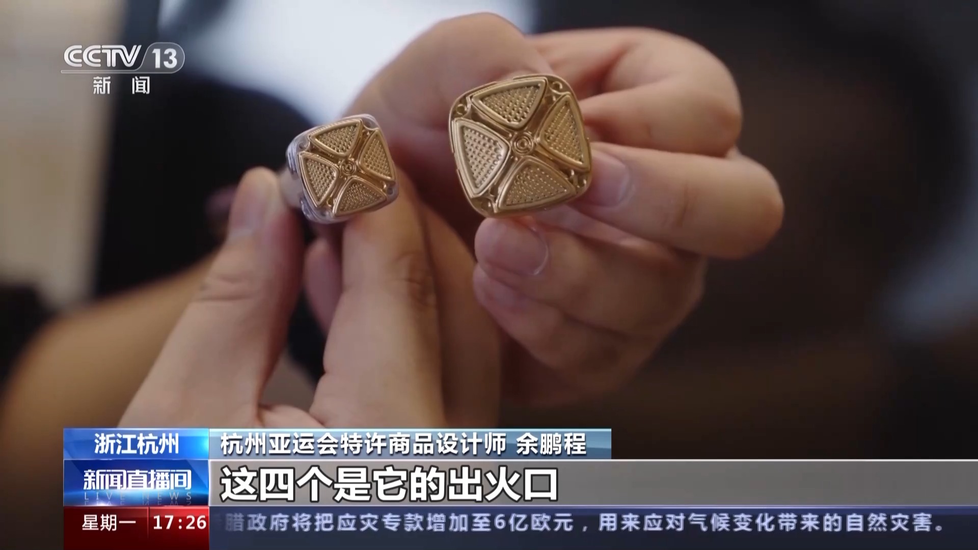 杭州亚运会特许商品设计师 余鹏程:杭州亚运会火炬命名为“薪火”,有很多元素是来自于杭州的良渚文化,我也想把火炬上的良渚文化的元素,包括其他比较重要的元素提取出来。