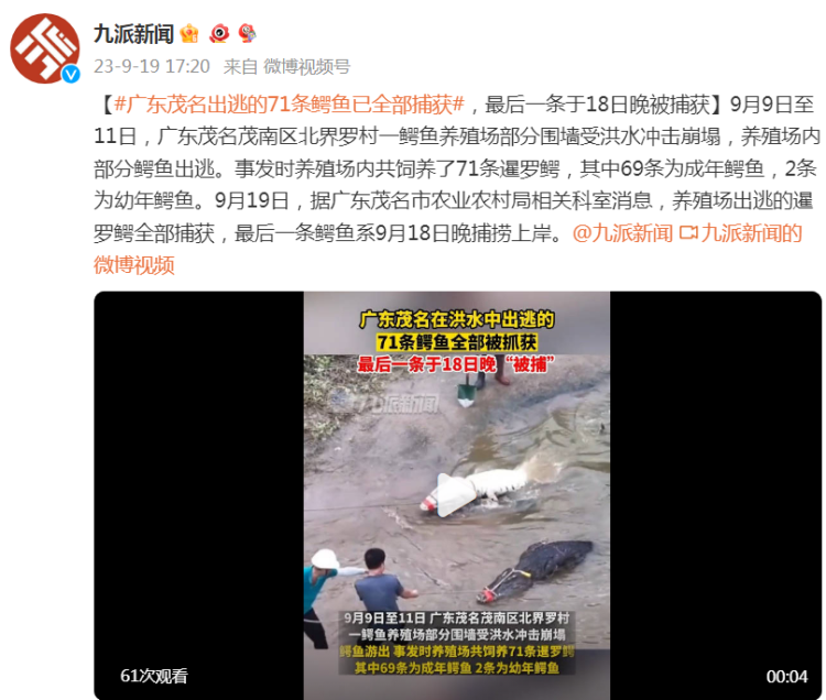 9月9日至11日,广东茂名茂南区北界罗村一鳄鱼养殖场部分围墙受洪水冲击崩塌,养殖场内部分鳄鱼出逃。事发时养殖场内共饲养了71条暹罗鳄,其中69条为成年鳄鱼,2条为幼年鳄鱼。9月19日,据广东茂名市农业农村局相关科室消息,养殖场出逃的暹罗鳄全部捕获,最后一条鳄鱼系9月18日晚捕捞上岸。