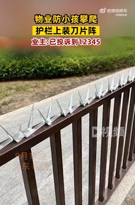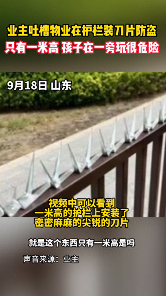 据媒体报道,9月18日,山东临沂一网友发视频称自家小区一米多高的护栏上被物业装满了刀片,反映给物业后,物业推诿责任。