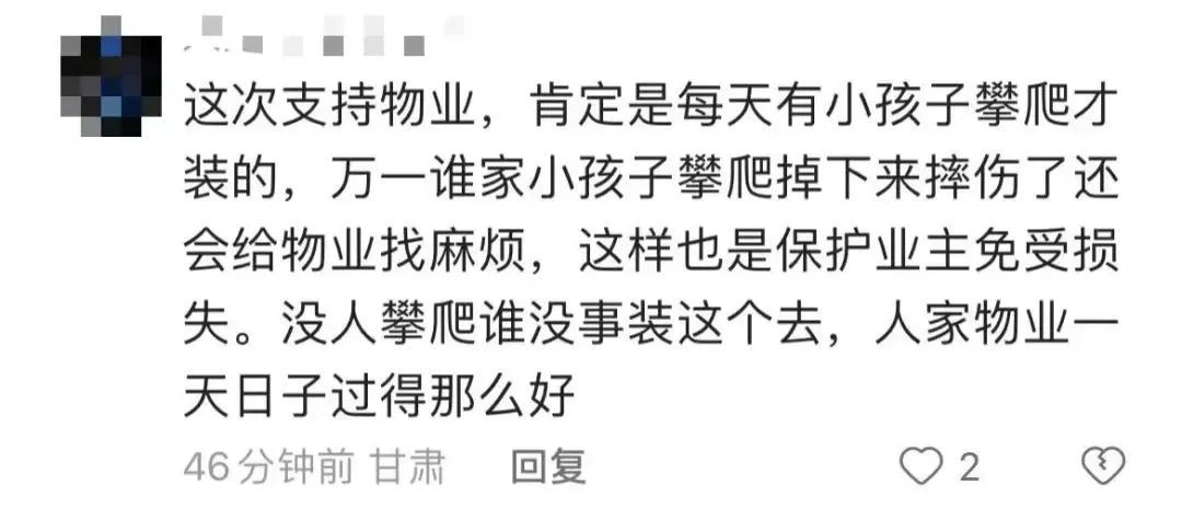 19日,小区物业表示,装刀片是为了防止小区内孩子来回攀爬,会在刀片附近加装提示,也希望家长跟孩子说明情况。该物业工作人员表示:“我们是新区物业,如果你感觉这样不行的话,去找老区物业经理。”