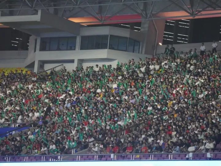 对于中国队在杭州亚运会的首秀,现场观众给予了极高的热情与回应,不仅每一次进球都传来了现场阵阵欢呼,可容纳6万人的黄龙体育中心体育场也达到了近4万的上座率,绿色的加油棒、身着球衣的球迷,还有穿插其中的点点红光,成为了现场的一道风景线。