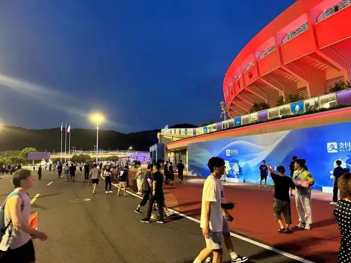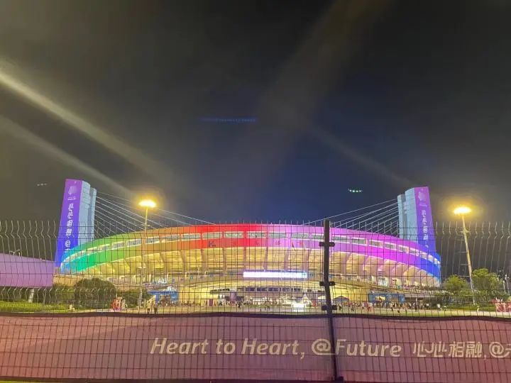 大批球迷开始入场,现场秩序井然,潮新闻记者也抵达媒体坐席,等待比赛的开始。场外,黄龙体育中心体育场披上了亚运色的“外衣”,相当吸睛。
