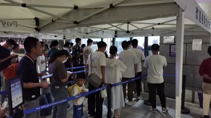 检票入口已经大排长龙,大家有序入场,不少球迷还手握纸质门票,与黄龙体育中心体育场来个合影留念。