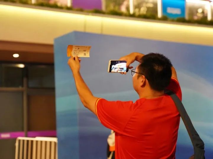与检票入口同样热闹的还有换票大厅,球迷们在这里把电子票换成纸质票,留作纪念。