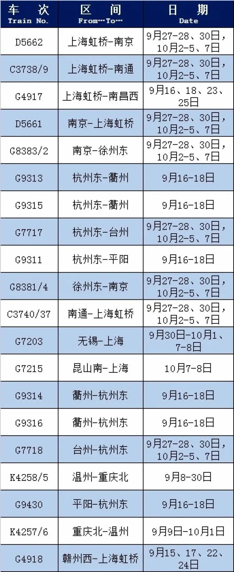 针对此次出行高峰,铁路部门已经增开了列车,包括9月27日-28日、9月30日、10月2日-5日以及7日增开上海虹桥至南京的D5662次,9月27日、28日、30日以及10月2-5日、7日增开上海虹桥至南通C3738/9次等。