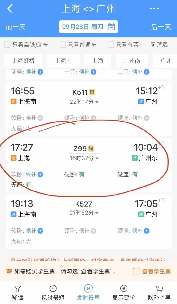 9月14日车票开售当天,9月28日晚从上海出发的3趟卧铺车车票全部秒光,三个家庭连一张票都没有抢到。其中,从上海站出发的一趟车时间最短,更是连候补席位都已满。“铁路部门不是一直倡导我们用候补功能嘛,结果是连候补的机会都没有,不但车票秒光,连候补席位都秒光。”同行的曹先生感叹道。