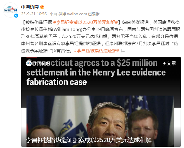 综合美媒报道,美国康涅狄格州检察长汤伟麟(William Tong)办公室当地时间19日晚间宣布,同意与两名因判谋杀罪而服刑30年冤狱的男子,以2520万美元达成和解。两名男子当年入狱,有部分是依据康州著名刑事鉴识专家李昌钰提供的证据,但康州联邦法官7月判决李昌钰对“伪造谋杀案证据”负有责任。