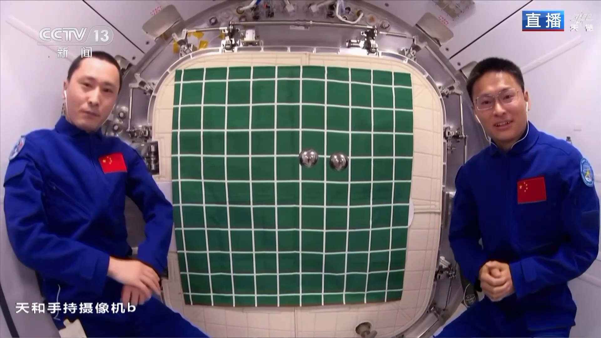 航天员 桂海潮:同学们,我手里有一个一模一样的钢球,接下来我就准备抛出手中的球去碰撞静止的球,让我们一起来验证一下空间站里的动量守恒定律。