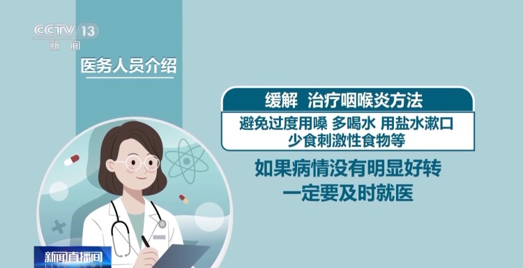 医务人员介绍,缓解、治疗咽喉炎的方法包括:避免过度用嗓、多喝水、用盐水漱口、少食刺激性食物等。如果病情没有明显好转一定要及时就医。