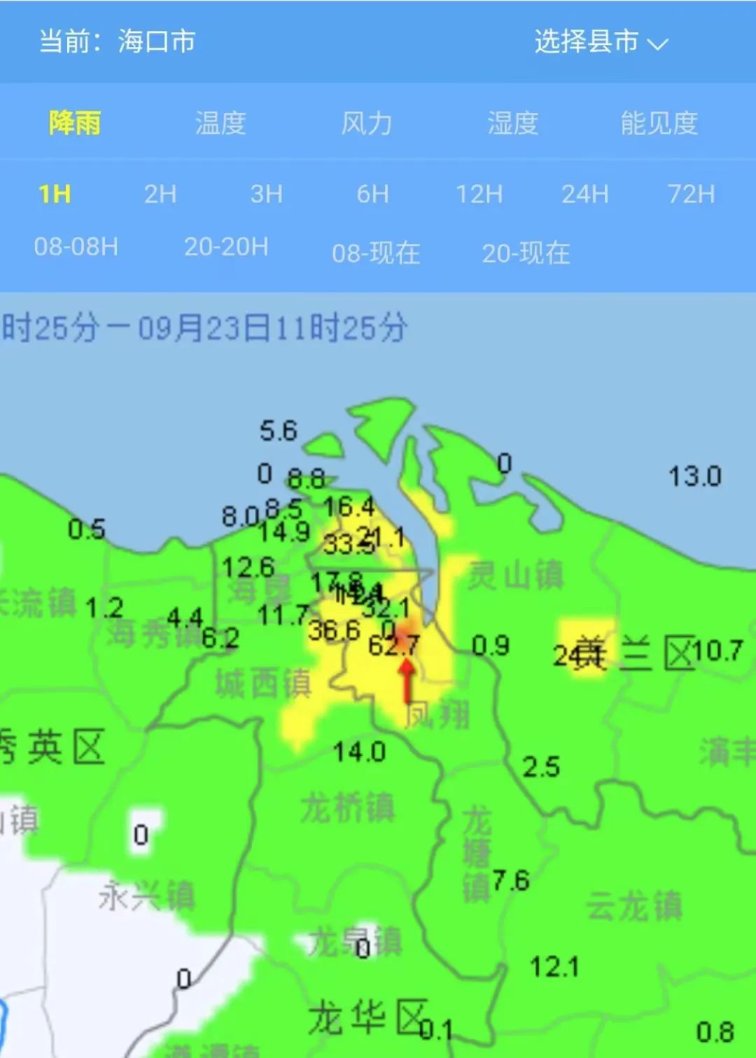 1小时降雨量已达62.7毫米