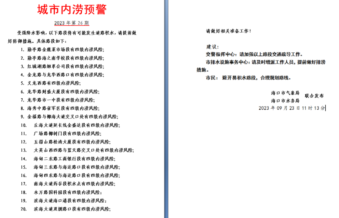 11时13分海口市气象局、海口市水务局联合发布城市内涝预警。