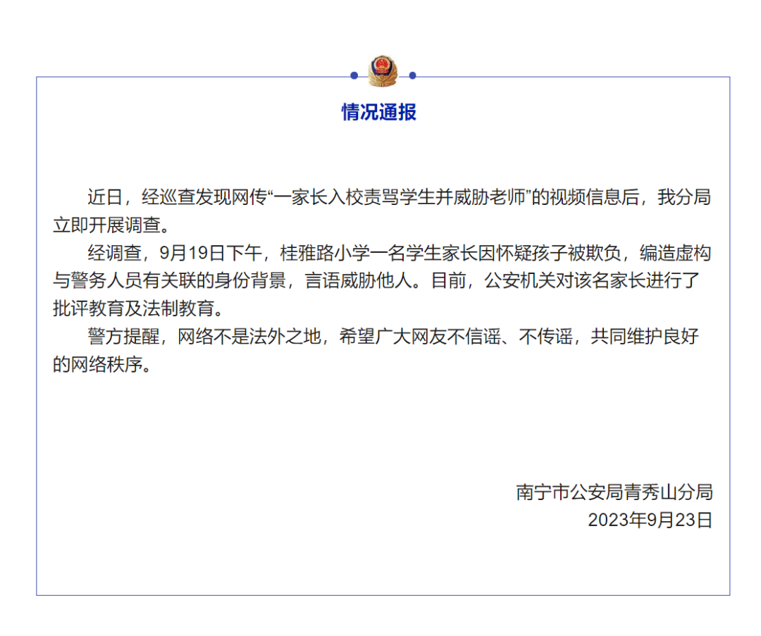 通报称,经调查,9月19日下午,桂雅路小学一名学生家长因怀疑孩子被欺负,编造虚构与警务人员有关联的身份背景,言语威胁他人。目前,公安机关对该名家长进行了批评教育及法治教育。