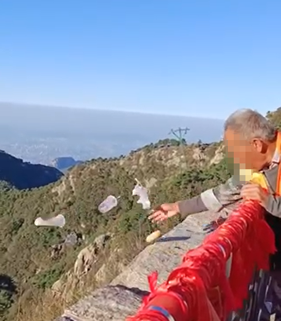 9月22日,有网友拍摄到泰山景区一位环卫工往悬崖下方扔垃圾。据了解,拍摄位置在泰山的白云居平台地面,视频中,一名环卫工人从平台上扫起豆浆杯、纸屑等垃圾,随后探出身子扔到了悬崖下方。从视频中,环卫工人身后不足两米的地方就有一个垃圾桶。