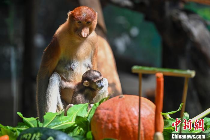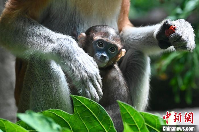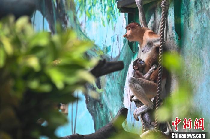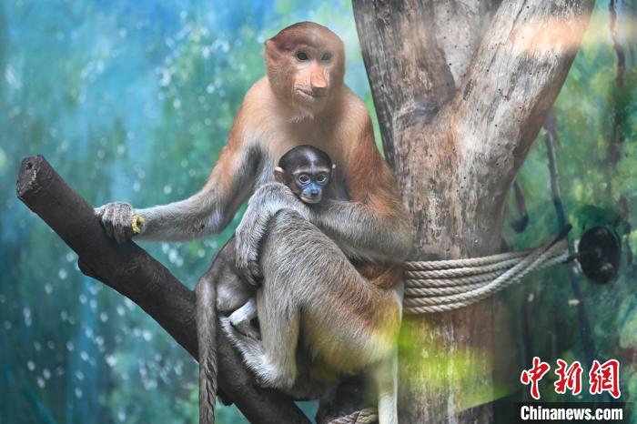 9月23日,广州长隆野生动物世界长鼻猴家族新成员“森怡”与公众见面。目前“森怡”通体黑蓝毛色,与母亲生活在一起。