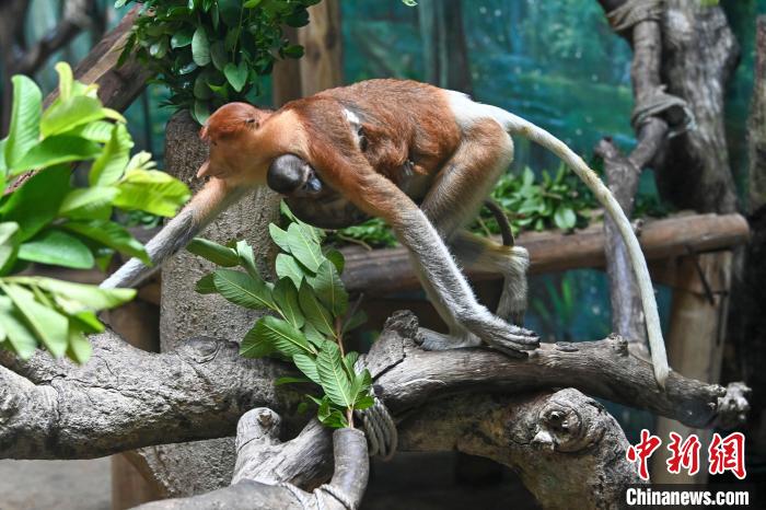 9月23日,广州长隆新生长鼻猴宝宝“森怡”依偎在母亲怀里。记者 陈骥旻 摄