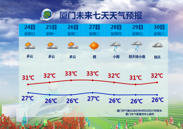厦门地区天气:多云,东北风3~4级,气温:26~32℃;