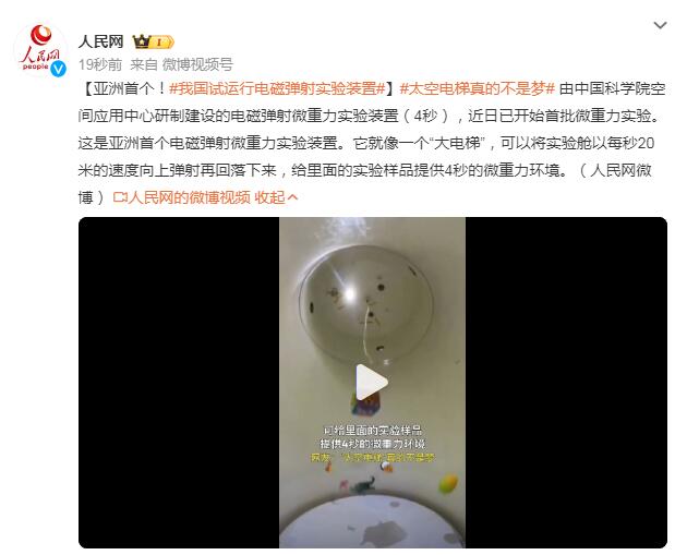 由中国科学院空间应用中心研制建设的电磁弹射微重力实验装置(4秒),近日已开始首批微重力实验。这是亚洲首个电磁弹射微重力实验装置。它就像一个“大电梯”,可以将实验舱以每秒20米的速度向上弹射再回落下来,给里面的实验样品提供4秒的微重力环境。