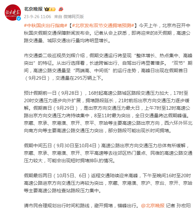 预计假期前一日(9月28日),16时起高速公路城区路段交通压力加大,17时至20时交通压力逐步向外扩展,拥堵路段延长,21时前后出京方向交通压力逐步缓解。假期首日(9月29日),是出京方向交通压力最大日,上午7时至12时高速公路出京方向交通压力将持续集中,8至11时最为突出,全日交通量将达假期峰值。京藏、京承、京港澳、京开、京平、京哈等主要高速公路出京方向,西六环外环北向南方向等主要高速公路交通压力突出,部分路段可能出现长时间拥堵。