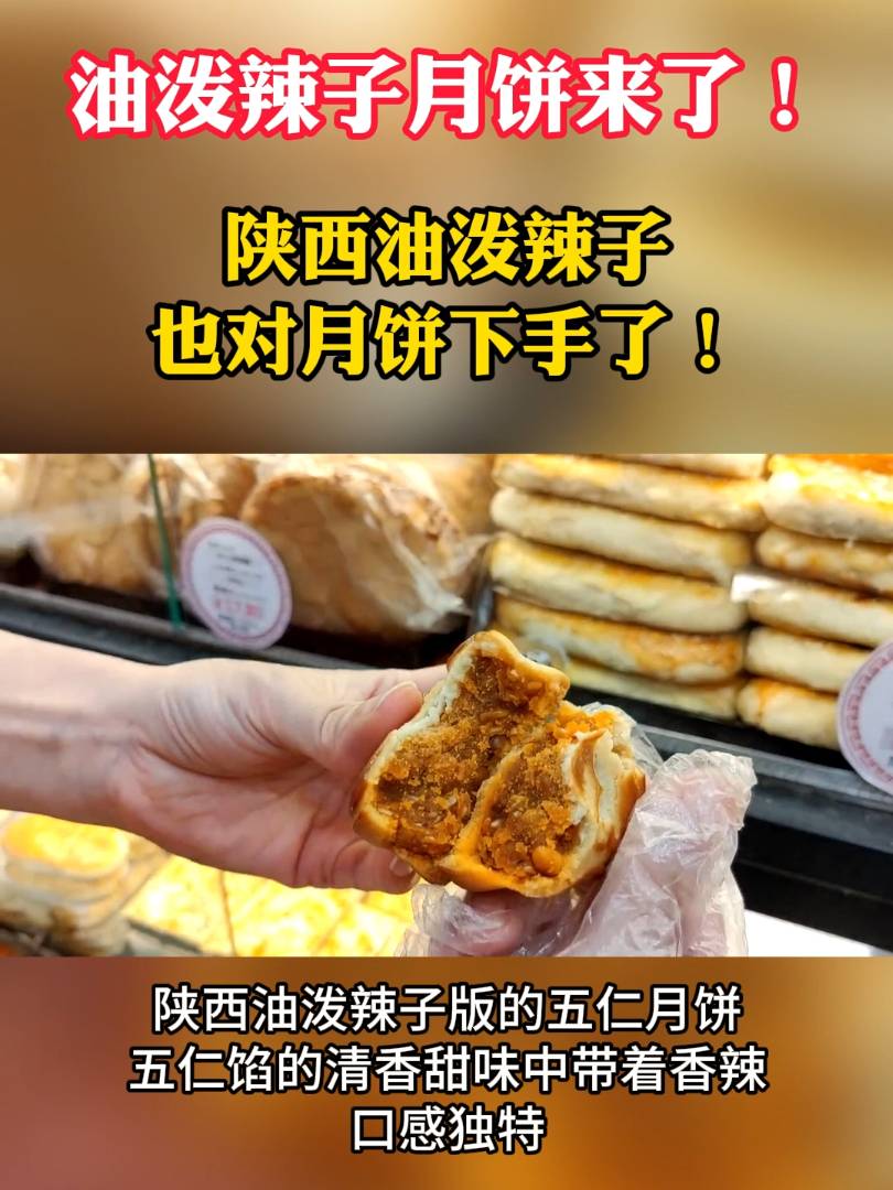 还有陕西油泼辣子版的五仁月饼,五仁馅的清香甜味中带着香辣,不尝一口很难想象是怎样的口感,网友:爱吃油泼辣子和月饼的人都沉默了。