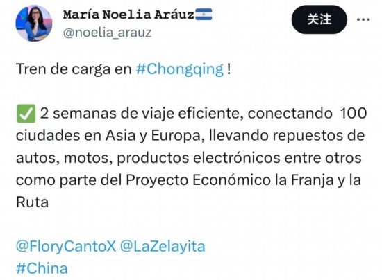 尼加拉瓜电视4台记者诺埃里亚·阿劳兹发文称,每天有上千吨货物由中欧班列从重庆运往欧洲,在15天里途径哈萨克斯坦、俄罗斯、白俄罗斯、波兰,最终抵达德国。中欧班列使世界上100多个城市连接在一起。