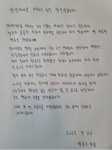 报道称,权纯雨在26日通过大韩体育会公开了一封亲笔道歉信。他在信中表示:“我向所有支持国家代表队比赛的国民和在场观众表示真诚的歉意。对不起。”接着,他写道:“再次向因我的无礼行为而感到不快的萨姆瑞吉选手表示诚挚的歉意。”