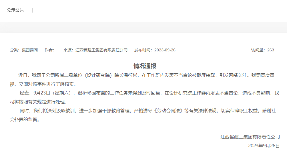 近日,我司子公司所属二级单位(设计研究院)院长温衍彬,在工作群内发表不当言论被截屏转载,引发网络关注。我司高度重视,立即对该事件进行了解核实。