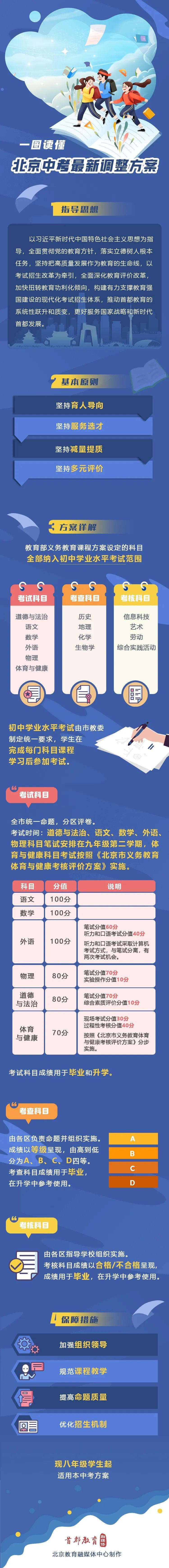 据了解,北京市将修订初中学业水平考试实施办法,明确规定考试时间、成绩呈现方式以及实验操作测试方案,制定道德与法治科目成绩计入初中学生综合素质评价相关结果的实施细则等。