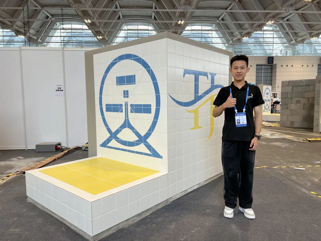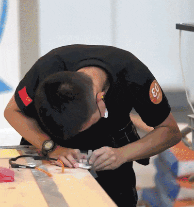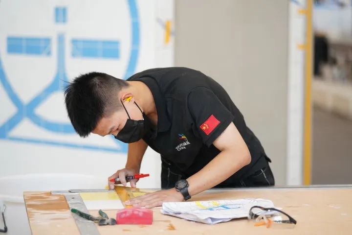 比赛不仅工程量大,还会为选手制造难点。当时,林宇翔分到的比赛墙面误差很大,比赛第一天就耗费了大量时间将墙面抹平。另外,他施工所站的位置还有一个井盖,踩在上面井盖就会晃动,很难保持平衡。