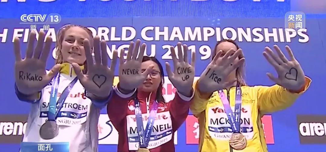 2019年游泳世锦赛,同一项目上的几名对手在领奖台上向她送上了祝福。