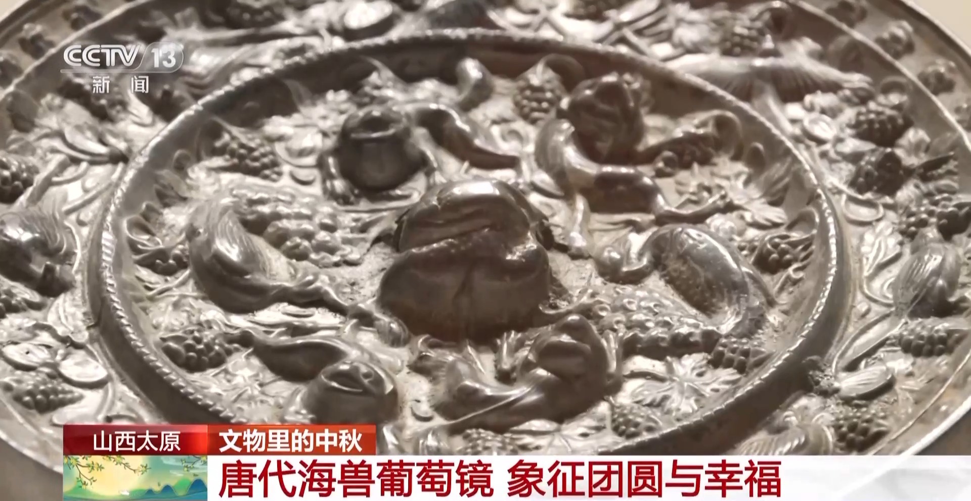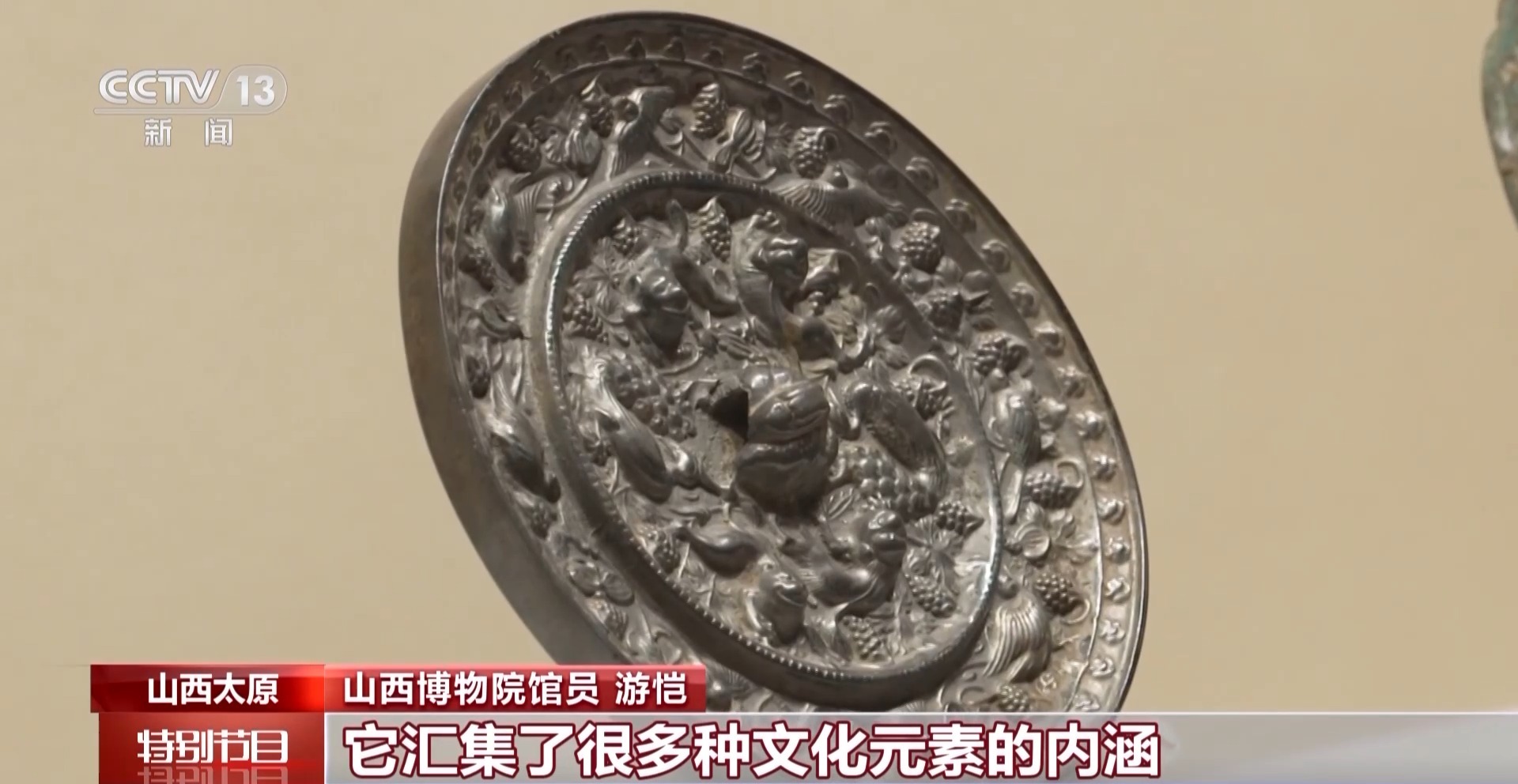 山西博物院馆员游恺:圆形铜镜的轮廓与月相的团团圆圆相联系。小小一面铜镜当中,它汇集了很多种文化元素的内涵,可以说体现了唐朝那种兼容并蓄、繁荣开放的状态。