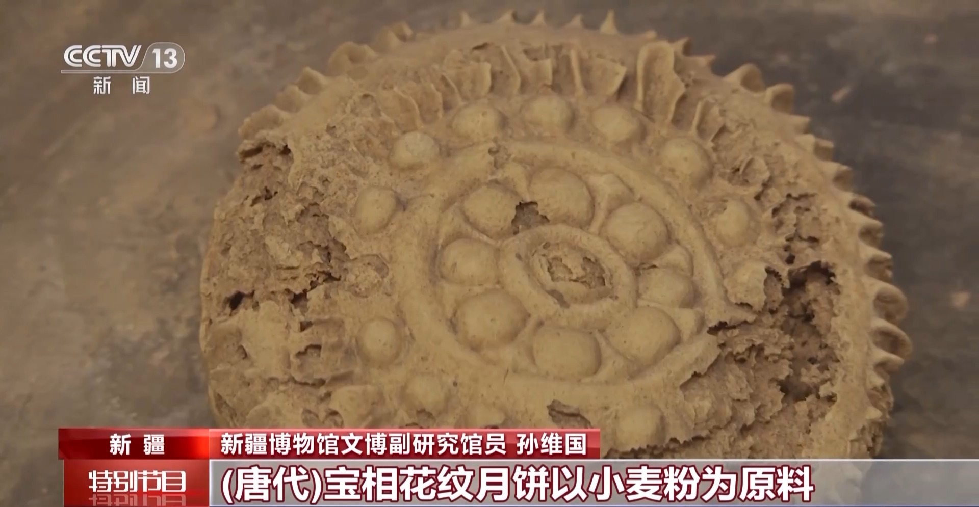 新疆维吾尔自治区博物馆文博副研究馆员 孙维国:(唐代)宝相花纹月饼以小麦粉为原料,模压成型,烘焙而成,反映了唐代人们高超的面点制作技艺。吐鲁番气候干旱、降雨较少,可以使水分迅速蒸发而不至于变质,这就使大量的文物,尤其是食品得以保存至今。