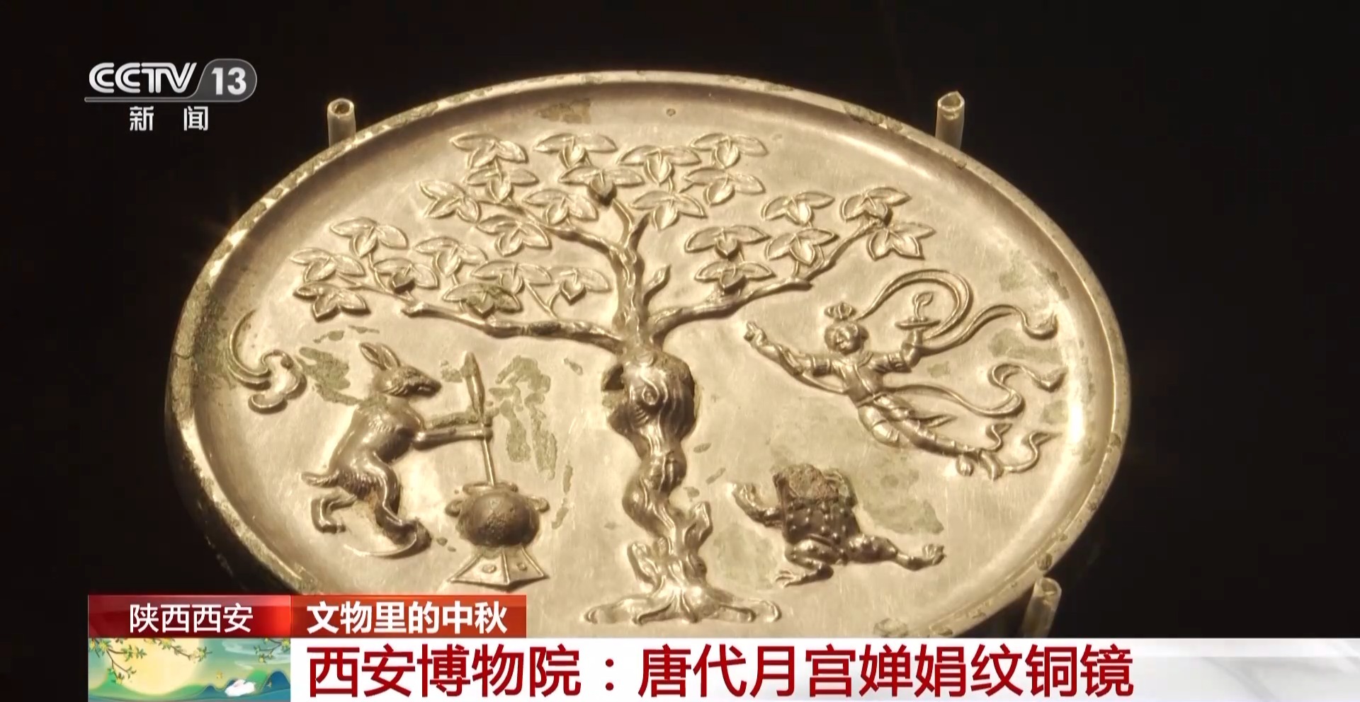 西安博物院高级讲解员 李乾鑫:中国人对于团圆的形象其实是一直以来在追求的。我们这面镜子的造型就是圆形的,符合团圆之意,表现了人们对于中秋美好事物的一种向往。日常使用的器物上能做出这么精美的装饰图案,也体现了人们对日常生活的高度追求。