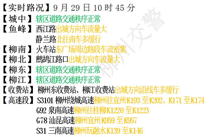 高速公路方面 ,S3101柳州绕城高速柳州往宜州K193至K202和K171至K174、G92泉南高速柳州往桂柳K1220至K1223、G78汕昆高速柳州宜州K959至K957、S31三南高速柳州至融水K139至K146等路段车多缓行。