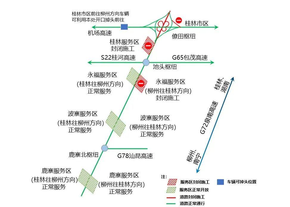 在桂柳高速公路方面,在柳州往桂林方向鹿寨北互通立交处因为施工原因四车道被压缩成一车道,容易出现拥堵。建议从南宁、柳州往桂林、湖南的车辆从G78汕昆高速+G65包茂高速(阳鹿高速)或者从S31三南高速+S22桂河高速前往目的地。 此外,需要提醒的是波寨收费站已于28日(昨天)晚上22时全面开通投用。