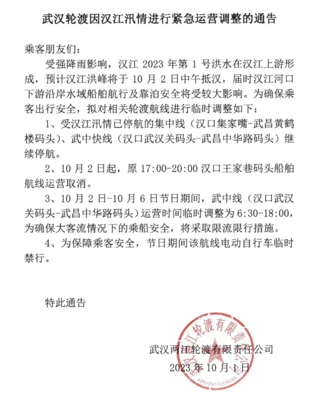 预计汉江洪峰将于10月2日中午抵汉 ,届时汉江河口下游沿岸水域船舶航行及靠泊安全将受较大影响。为保障乘客安全,10月1日,武汉轮渡发布通告,对相关轮渡航线进行紧急运营调整。
